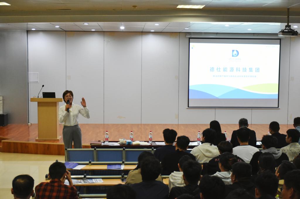 德仕集团高级副总裁吴丽丽女士以个人成长故事为引,展开了与学子们的真诚对话。她从学生时代的梦想谈起,分享了自己在德仕集团的职业历程,并深入剖析了石油行业的现状与未来。随后,她系统介绍了德仕集团的发展版图与业务布局,并重点解读了“德仕特色班”的核心优势:包括量身定制的特色课程、贴近实战的运营模式以及广阔的就业前景,为学子们勾勒出一幅清晰的职业发展蓝图。