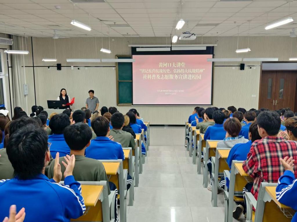 为隆重纪念中国人民抗日战争暨世界反法西斯战争胜利80周年,深入贯彻落实爱国主义教育要求,9月17日晚,由山东胜利职业学院马克思主义学院联合东营市社会科学界联合会共同主办的“黄河口大讲堂”社科普及志愿服务宣讲活动在山东胜利职业学院举行。本次活动以“铭记东营抗战历史,弘扬伟大抗战精神”为主题,为200余名师生带来了一堂沉浸式的红色历史教育课。黄河三角洲生态文明研究中心主任董永国、黄河口社会科学编辑部副主任...