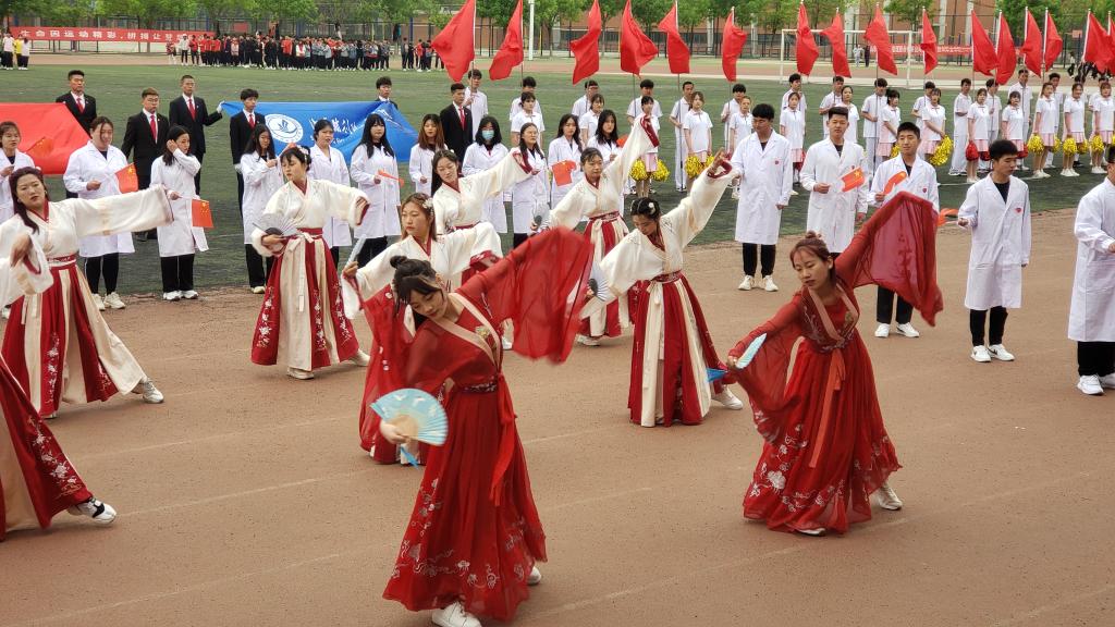 开幕式上,各个学院方阵的成员身着统一的服装,迈着整齐的步伐,精神抖擞地走到主席台前;他们在主席台前,以唱、跳或口号、武术等多样的形式尽情展示自己学院的专业文化特色,表达对学校的热爱,对运动的热情。
