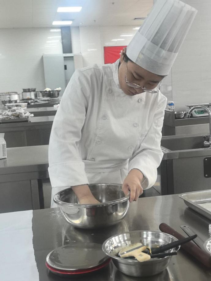 教师们纷纷亮出“绝活”,无论是需要精准火候掌控的抻面,还是工艺繁复、造型精美的象形点心,都展现了他们高超的专业技能和深厚的职业素养。教师们的精湛表演,不仅是一场高水平的技能比拼,更是一次生动的教学示范交流,为观摩的师生提供了宝贵的学习机会,有效促进了“双师型”教师队伍的建设。