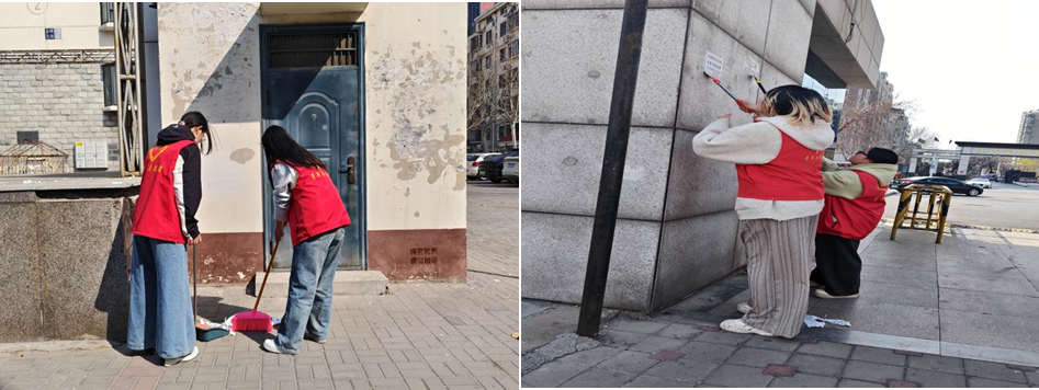 活动当天,志愿者们身着统一志愿服装,手持扫帚、簸箕等卫生清洁工具,在社区工作人员的统一安排下,迅速分组投入劳动。大家分工明确、配合默契,一部分志愿者负责清扫社区内的纸屑、烟头、塑料袋等垃圾,不放过卫生死角;另一组志愿者重点对墙面、单元门、电线杆、宣传栏上的小广告进行集中铲除清理。面对顽固胶印与张贴牢固的广告,同学们先浸湿、再铲除、后擦拭,耐心细致、不怕脏累,不放过一处盲区、不漏掉一张广告。