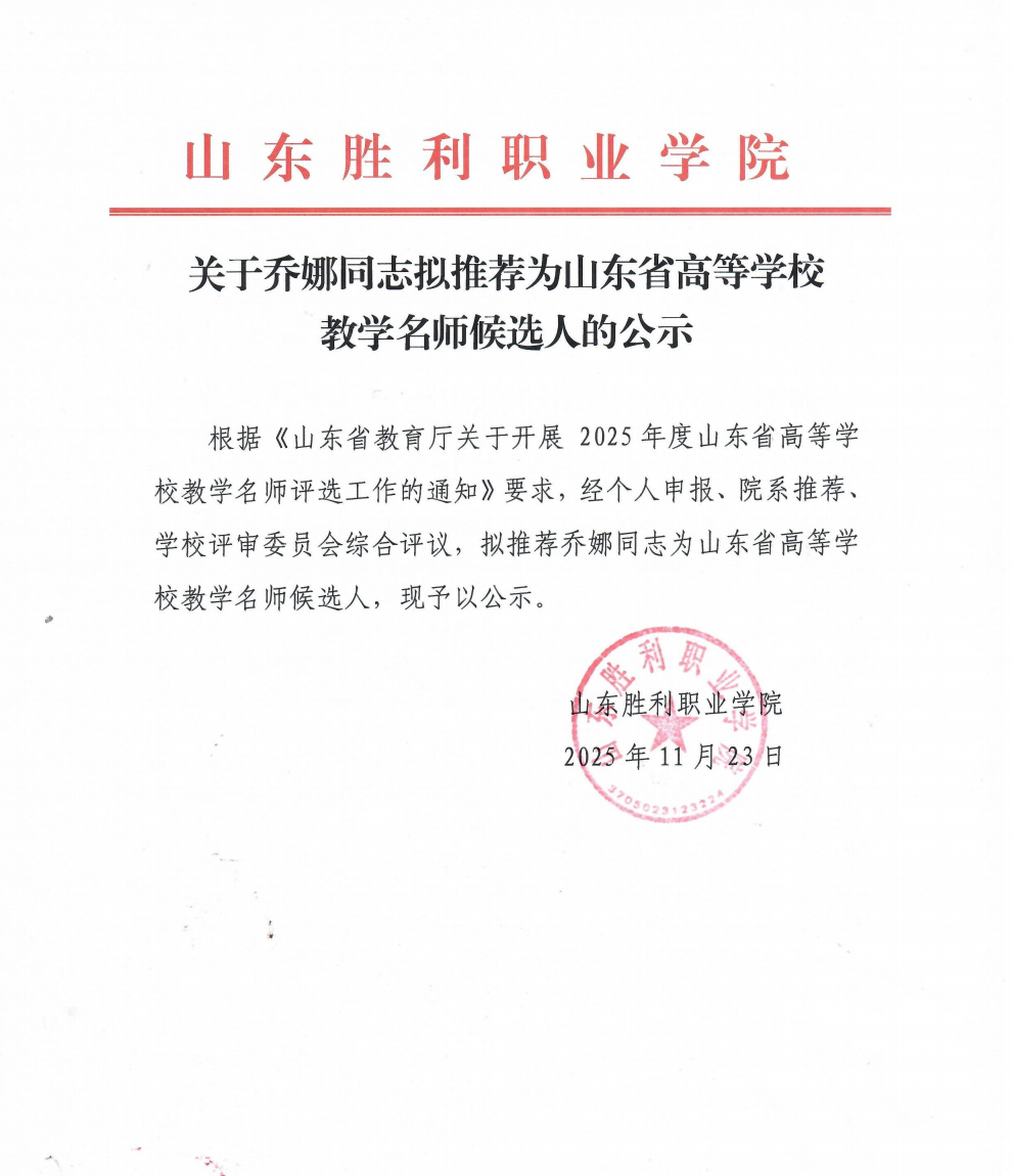 关于乔娜同志拟推荐为山东省高等学校教学名师候选人的公式