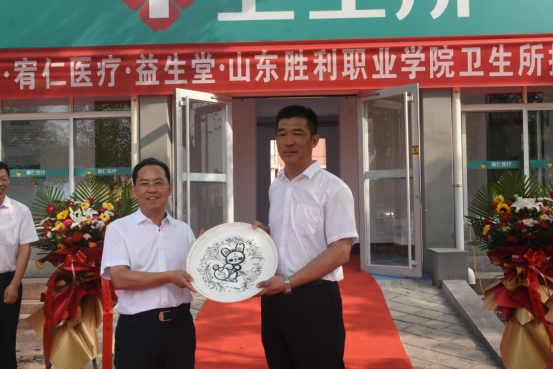 张玉珍院长、漱玉平民大药房连锁股份有限公司副总裁张华先生为山东胜利职业学院卫生所进行揭牌。