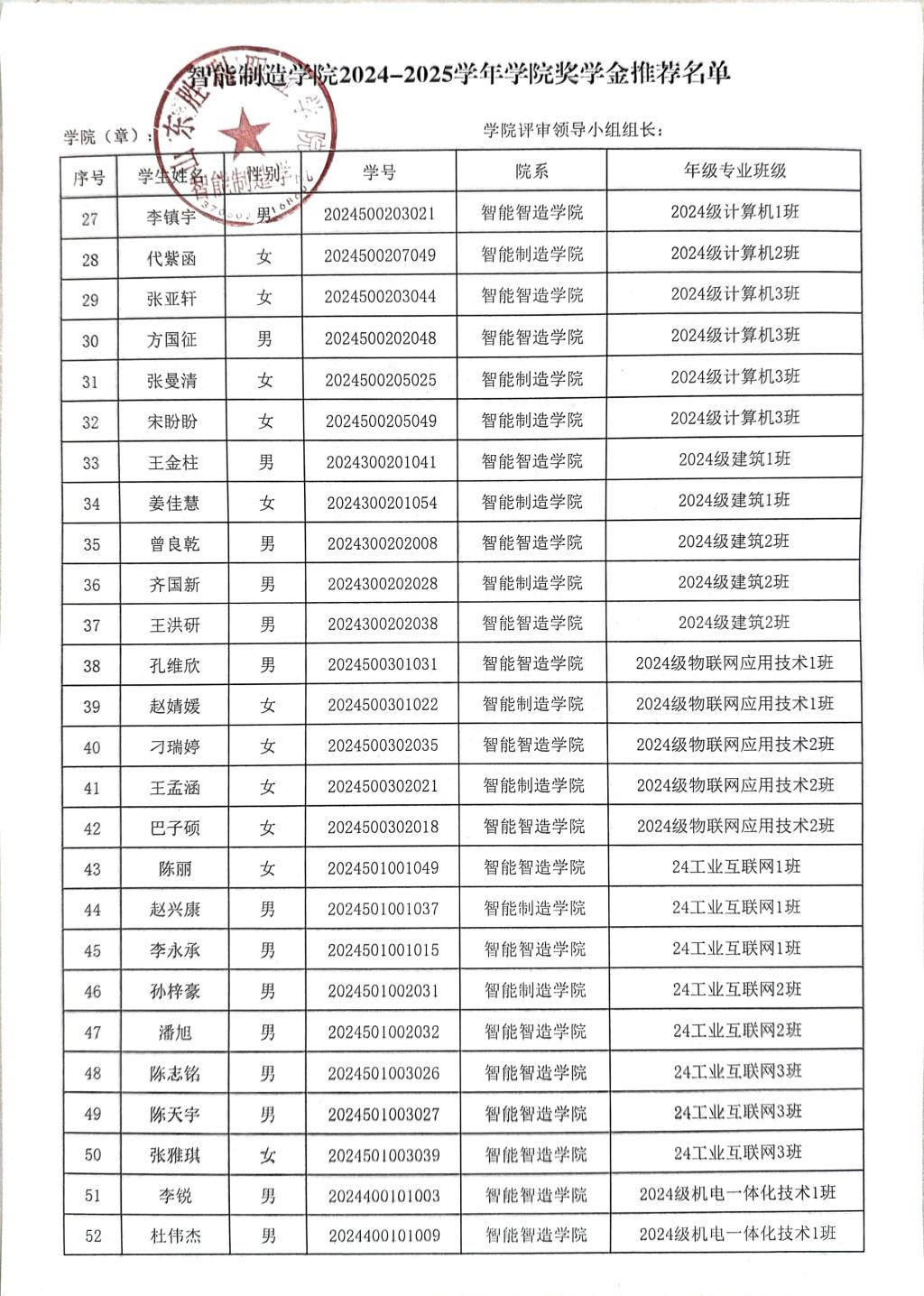 智能制造学院2024-2025学年学院奖学金推荐名单公示