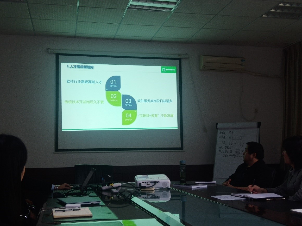 会议就行业发展趋势、人才需求、专业培养定位、课程体系以及人才培养模式等方面的认识和体会进行了坦诚交流,两家企业各自分享了在人才培养方面一些先进经验和好的做法。武汉美和易思教育科技集团的学术主任吴翔用详实的数据分析了当前软件与信息服务行业风口已现,云计算、大数据、区块链等技术应用方面人才培养在未来一段时期仍是热门之一;来自天津滨海迅腾教育集团教学部老师们分别就数字媒体技术、虚拟现实技术等人才需求和就业形势进行了分析交流。李旭东主任代表我院就计算机应用技术专业在人才培养、课程体系构建以及1+X证书制度的实施方面的思考和认识进行分享交流。