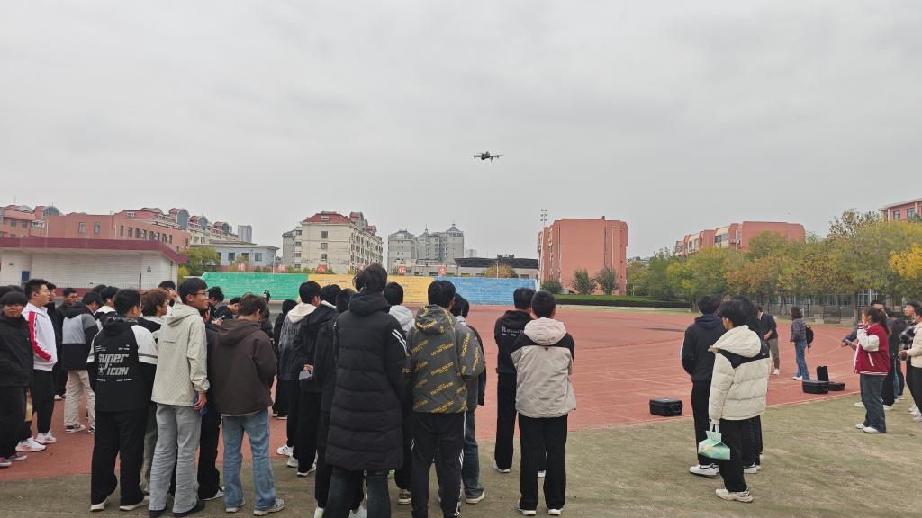 讲座结束后,实践体验环节在校园操场拉开帷幕。在技术人员的指导下进行模拟飞行训练。“左手摇杆控制高度与方向,右手摇杆控制前后左右位移,一定要注意杆量的轻重。”技术人员在旁耐心指导,纠正同学们的操作姿势。同学们满怀热情地参与到无人机实操中有的同学专注操控无人机遥控器,在专业人员指导下练习无人机的起飞、悬停、转向等基础动作;有的同学通过带屏遥控器实时查看无人机航拍画面,学习航拍构图与视角控制技巧。从教室的知识汲取到户外的实操尝试,同学们在“学”与“做”的结合中,切实感受到无人机技术的魅力,对专业技能提升和职业发展方向有了更直观的思考。