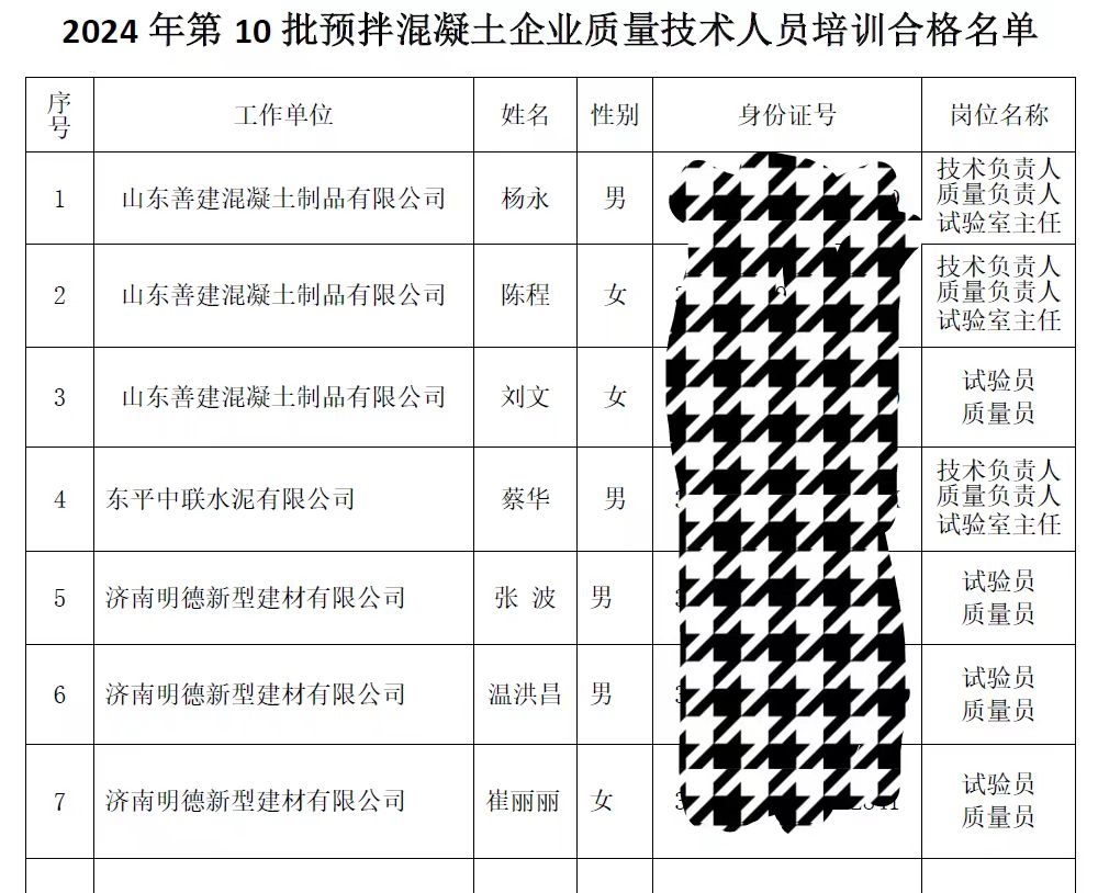 2024年第10批预拌混凝土企业质量技术人员培训合格名单