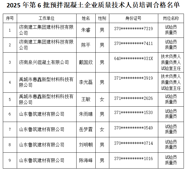 2025年第6批预拌混凝土企业质量技术人员培训合格名单