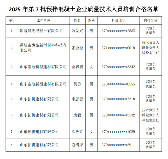 2025年第7批预拌混凝土企业质量技术人员培训合格名单