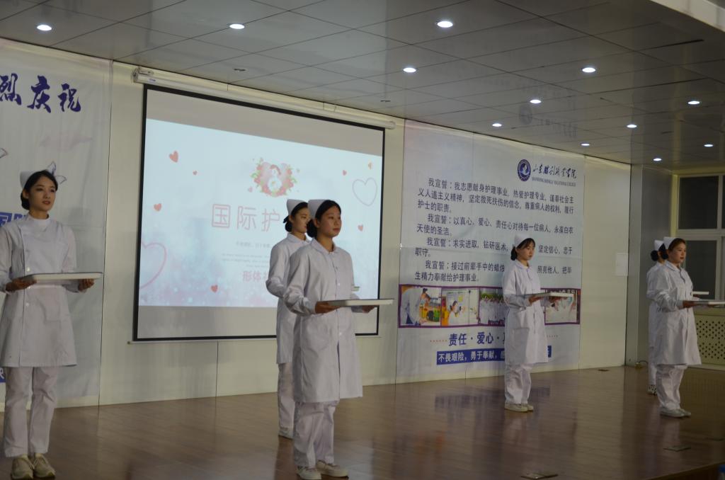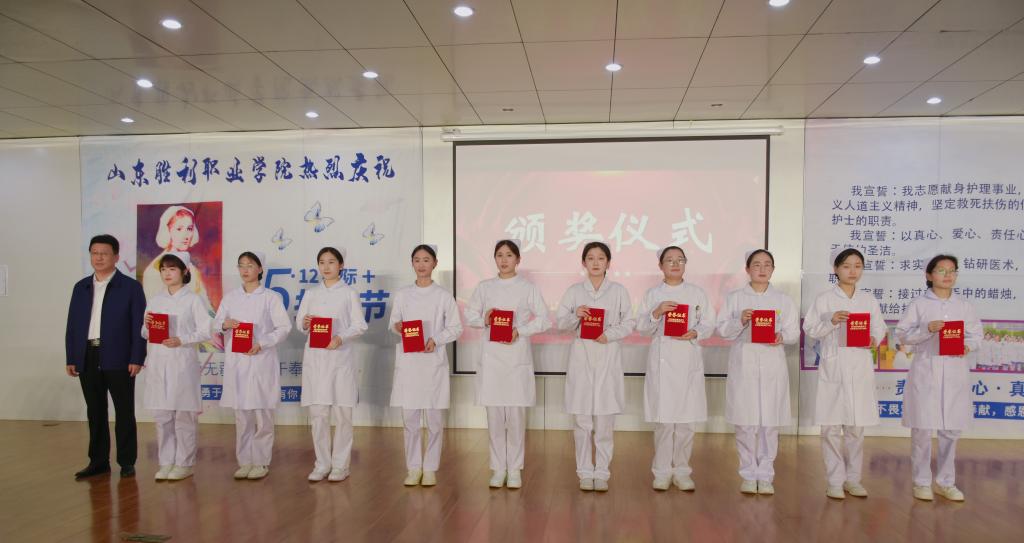 为了贯彻落实习近平总书记重要指示精神,引领学院师生发扬“敬佑生命、救死扶伤、甘于奉献、大爱无疆”的崇高精神,激发护士生对护理事业的热爱,坚定新时代白衣天使的责任与使命,为健康中国建设奉献青春的力量,5月8日,山东胜利职业学院护理学院“5·12国际护士节庆典活动”在炎培学堂508举办。山东胜利职业学院张玉珍院长、仲卫部副书记、王吉坡副院长、杨峰副院长、孙卫娟院长及学院相关处室和其它二级学院的领导老师参加了活动。