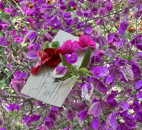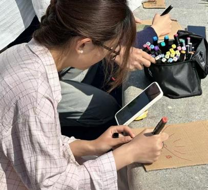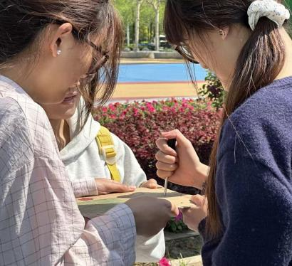 抵达植物园后,“花草板创作”正式拉开序幕。每位成员手持一块硬纸板然后在纸板上使用剪刀戳出小孔,然后在植物园内寻找合适的花草,将其插入小孔中,创作出独具特色的花草板作品。